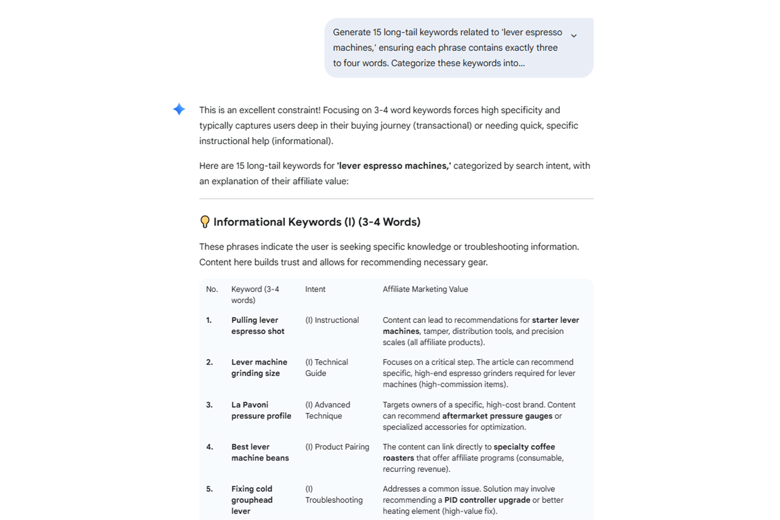 The AI will serve up gems like “Flair 58 pressure gauge” or “Lever espresso machine sale”. Then it’s your job to double-check them in SEO tools like Ahrefs or Mangools—because yes, even the most intelligent AI sometimes dreams.